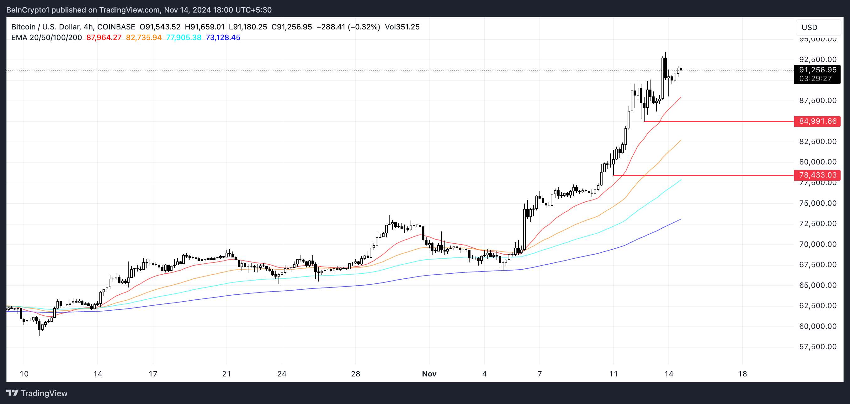 Se il trend perde forza, il prezzo di Bitcoin potrebbe affrontare un ritracciamento, testando potenzialmente i livelli di supporto chiave a 85.000 USD e 78.400 USD.