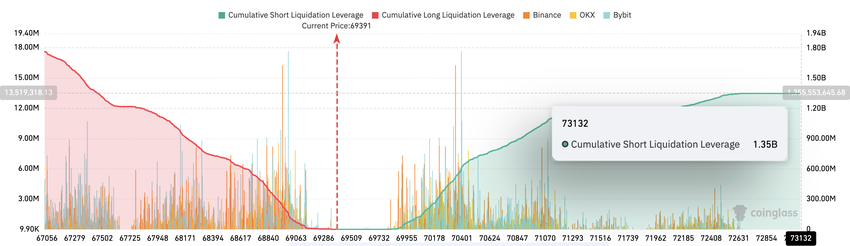 Tuttavia, rivela anche che la moneta non è esente da un calo se la lettura aumenta. Se il prezzo del Bitcoin dovesse scendere a 68.000 dollari, verranno liquidate posizioni lunghe per un valore di 1,13 miliardi di dollari.