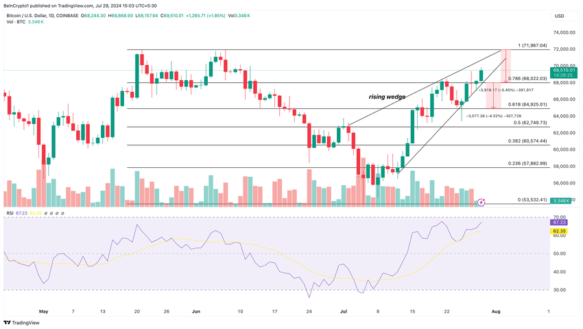 Il grafico giornaliero di BTC/USD rivela che la moneta ha formato un modello a cuneo ascendente. Questo schema è ribassista e segnala una possibile inversione durante un trend rialzista. Dal grafico mostrato di seguito, il cuneo ascendente potrebbe aiutare il BTC a superare i 70.000 dollari ed eventualmente a raggiungere i 71.967 dollari.