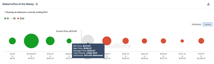 Come mostrato di seguito, 647.420 indirizzi hanno acquistato 3,69 milioni di BCH a un prezzo medio di 230 dollari. Se questi ultimi registrano i primi profitti, potrebbero rappresentare un grosso ostacolo.