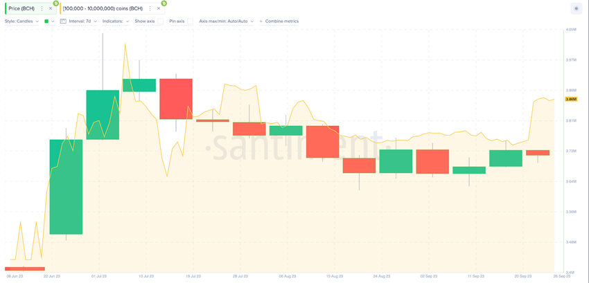 Indicativamente, le criptovalute con saldi da 100.000 a 10 milioni di BCH detenevano un totale di 3,74 milioni di BCH al 18 settembre. Ma il grafico sottostante illustra che, a partire dal 26 settembre, tale cifra è aumentata a 3,86 milioni di BCH.