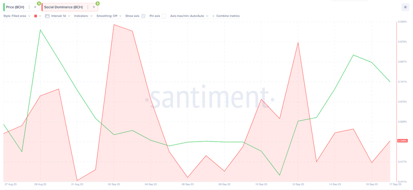 Nonostante i recenti guadagni di prezzo a due cifre, il Bitcoin Cash sta ancora volando sotto il radar di molti partecipanti al mercato retail. Come illustrato di seguito, mentre il Bitcoin Cash ha registrato un’impennata dall’11 settembre, la Social Dominance è scesa dallo 0,87% del 12 settembre allo 0,55% del 18 settembre.