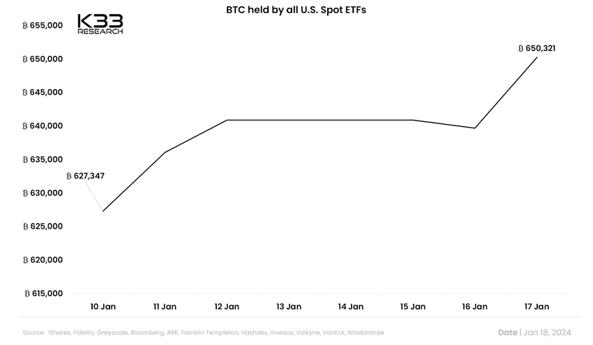 L’importanza dell’aumento delle partecipazioni di Tether in Bitcoin è rispecchiata dal crescente investimento in BTC da parte degli ETF Bitcoin spot. Finora, dal giorno del lancio, questi ETF detengono collettivamente 650.000 BTC, il che indica il crescente interesse istituzionale per il Bitcoin.