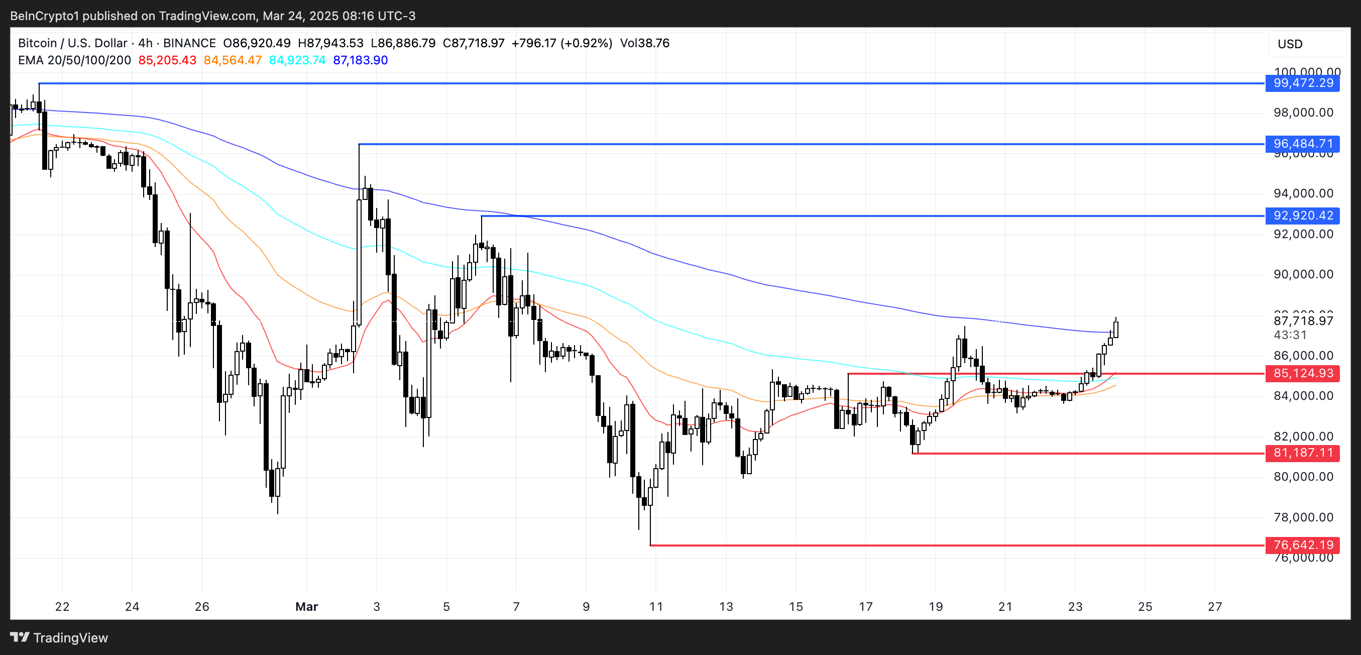 SponsoredSe questo momentum continuasse e si verificassero ulteriori golden cross, il prezzo di Bitcoin potrebbe puntare a livelli di resistenza chiave. La prima grande resistenza si trova a $92.920, e un breakout riuscito potrebbe vedere BTC spingersi verso $96.484.