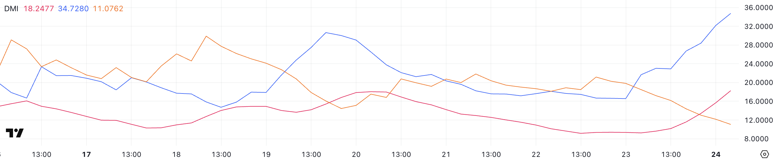 Insieme all’ADX, il +DI (Indicatore Direzionale Positivo) e il -DI (Indicatore Direzionale Negativo) forniscono informazioni sulla direzione della tendenza. Attualmente, il +DI è salito a 34,7 da 16,57 ieri, mentre il -DI è sceso a 11 da 21,17.