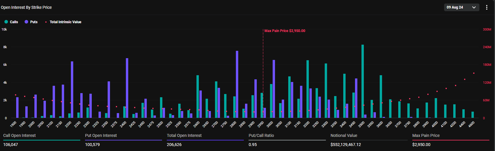SponsoredEthereum ha 552,13 milioni di dollari di opzioni in scadenza, con 206.626 contratti. Questa cifra è in aumento rispetto ai 183.756 contratti della settimana precedente. Il punto di dolore massimo per queste opzioni è di 2.950 dollari e il rapporto put-to-call è di 0,95.