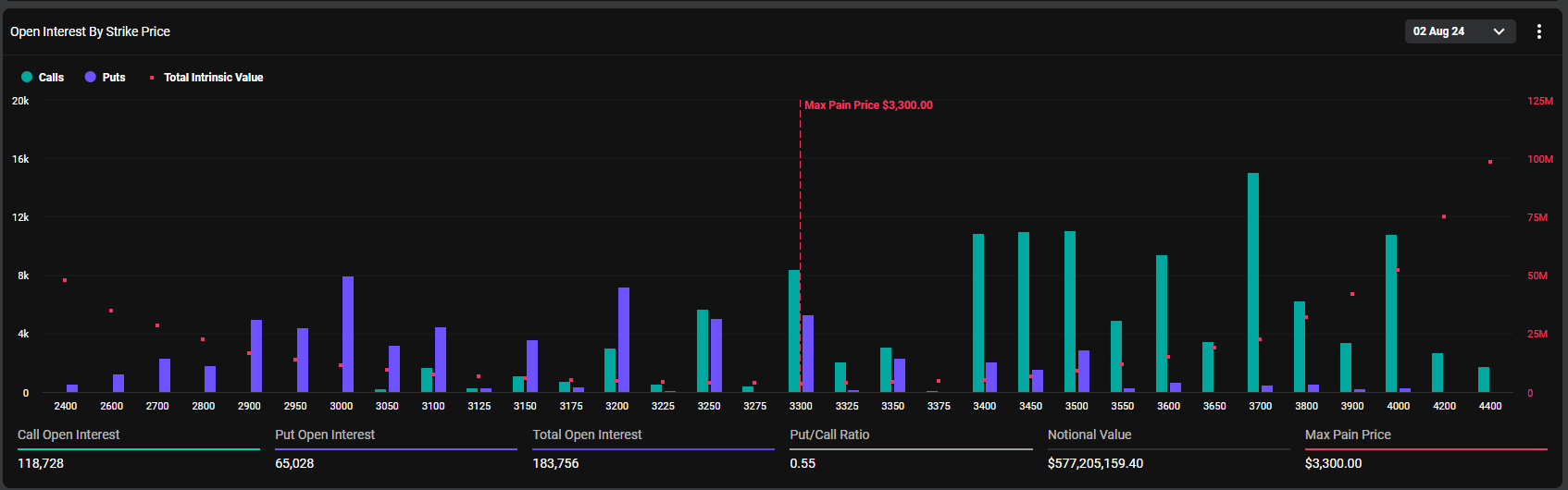 Inoltre, Ethereum vede la scadenza di 183.756 contratti con un valore nozionale di 577,2 milioni di dollari. Il punto di sofferenza massimo per questi contratti è di 3.300 dollari, con un rapporto put/call di 0,55.