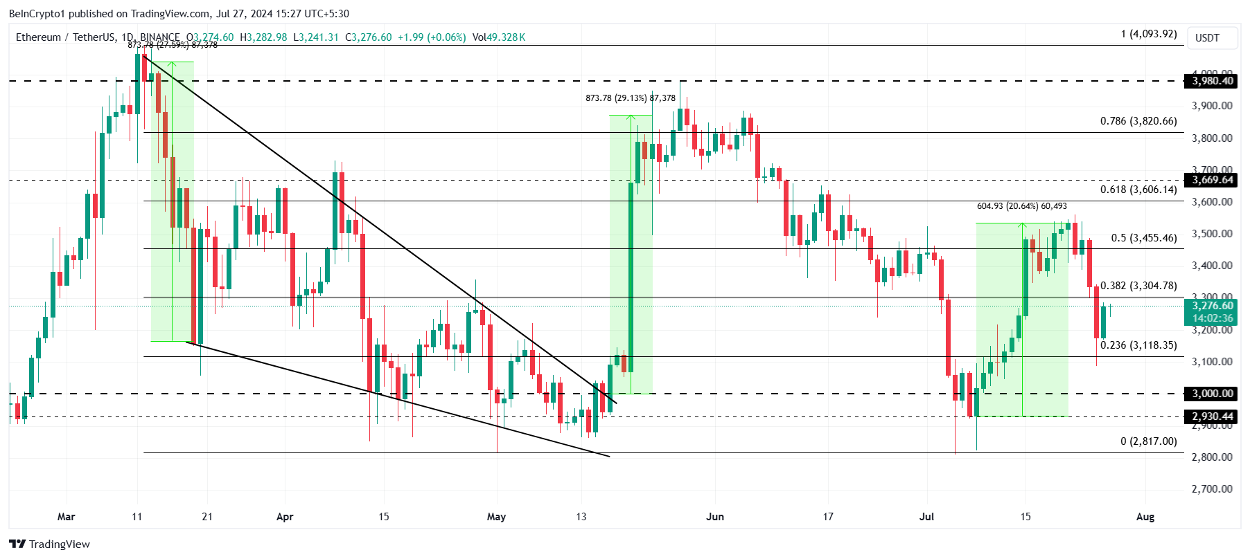 Il prezzo di Ethereum ha segnato una brusca discesa da 3.500 a 3.276 dollari al momento della scrittura. Questo ha portato ETH a scendere fino alla linea di ritracciamento di Fibonacci del 23,6%. Questa linea è nota anche come pavimento di supporto del mercato ribassista e tende a prevenire un ribasso. Questo potrebbe spingere l’ETH verso i 3.500 dollari nei prossimi giorni.