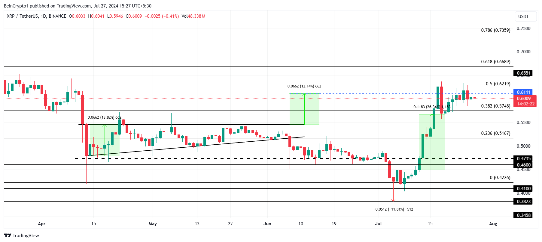 Coincidendo con la linea Fib del 50%, la violazione di questo livello consentirebbe un aumento a 0,65 dollari. Questo segnerebbe un massimo di quattro mesi per il token nativo di Ripple, avvicinandolo alla linea Fib del 61,8%.