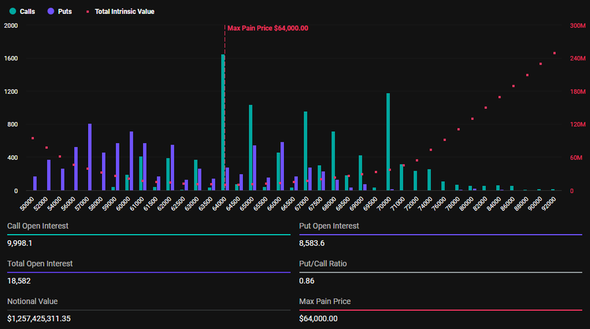 Secondo i dati su Deribit, 18.583 opzioni su Bitcoin scadranno oggi, leggermente più delle 18.271 contratti della scorsa settimana. I contratti di opzioni in scadenza oggi hanno un rapporto put-to-call di 0,86 e un punto di massimo dolore di 64.000 USD.