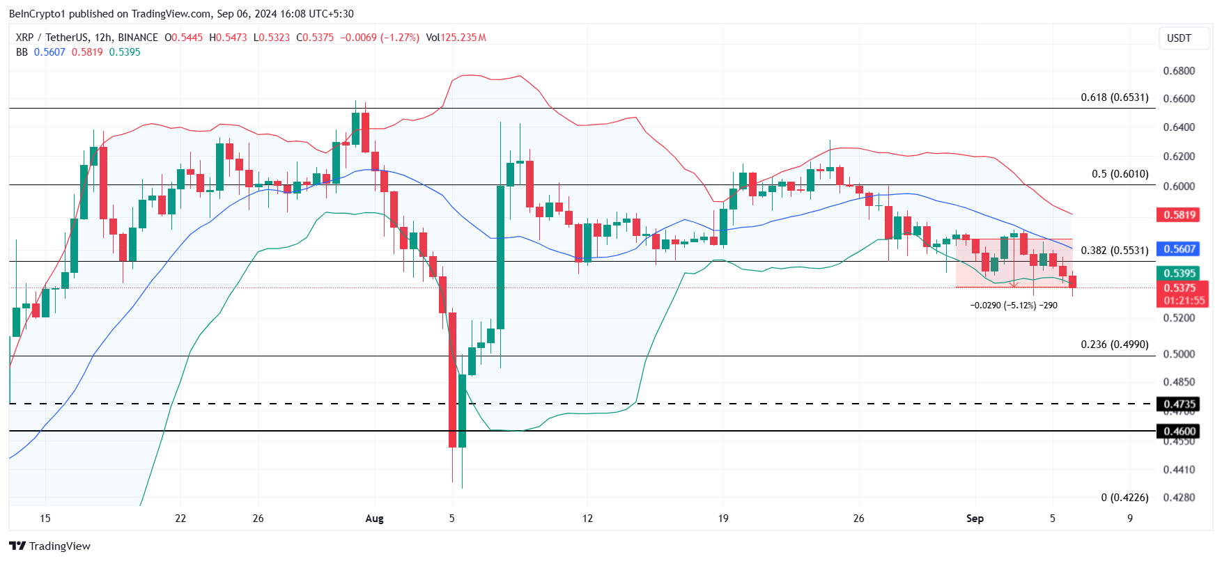 Le Bande di Bollinger mostrano attualmente una compressione sul grafico a 12 ore, indicando il potenziale per un calo a breve termine. Con le candele posizionate sotto la linea di base, questa configurazione tecnica suggerisce che XRP potrebbe testare la linea di Fibonacci del 23,6% a 0,49 USD. Una mossa del genere confermerebbe ulteriormente il sentimento ribassista nel mercato.