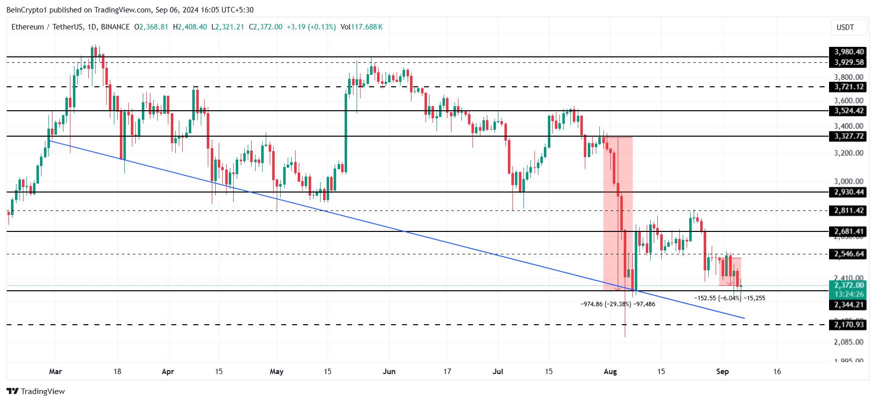 Il prezzo di Ethereum è attualmente a 2 372 USD, avvicinandosi a un livello di supporto cruciale di 2 344 USD. L’altcoin ha registrato un calo del 6% nell’ultima settimana, ma questo ribasso potrebbe non continuare nel futuro immediato. L’azione recente del prezzo suggerisce che Ethereum potrebbe stabilizzarsi o riprendersi piuttosto che estendere ulteriormente le sue perdite.