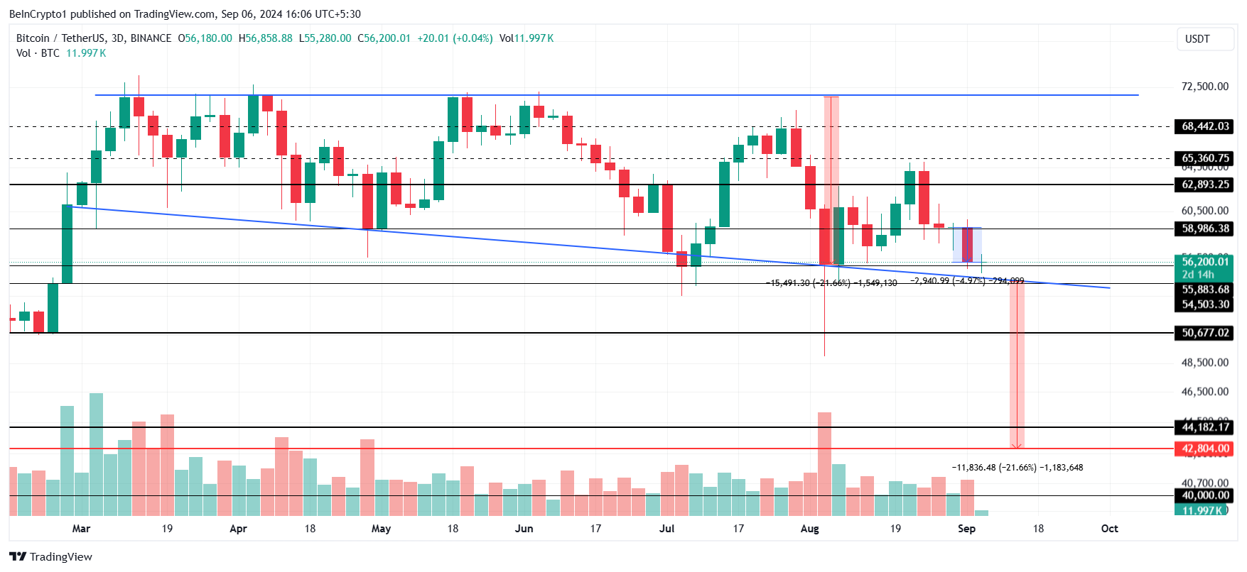 Nella prossima settimana, Bitcoin testerà il livello di supporto a 55 883 USD, un’area cruciale per i tori. Un rimbalzo da questo livello potrebbe permettere a BTC di riprendersi, ma perderlo potrebbe spingere il prezzo verso 54 500 USD. Bitcoin potrebbe essere pronto per un crollo dal modello di cuneo ribassista se questo supporto si rompe.