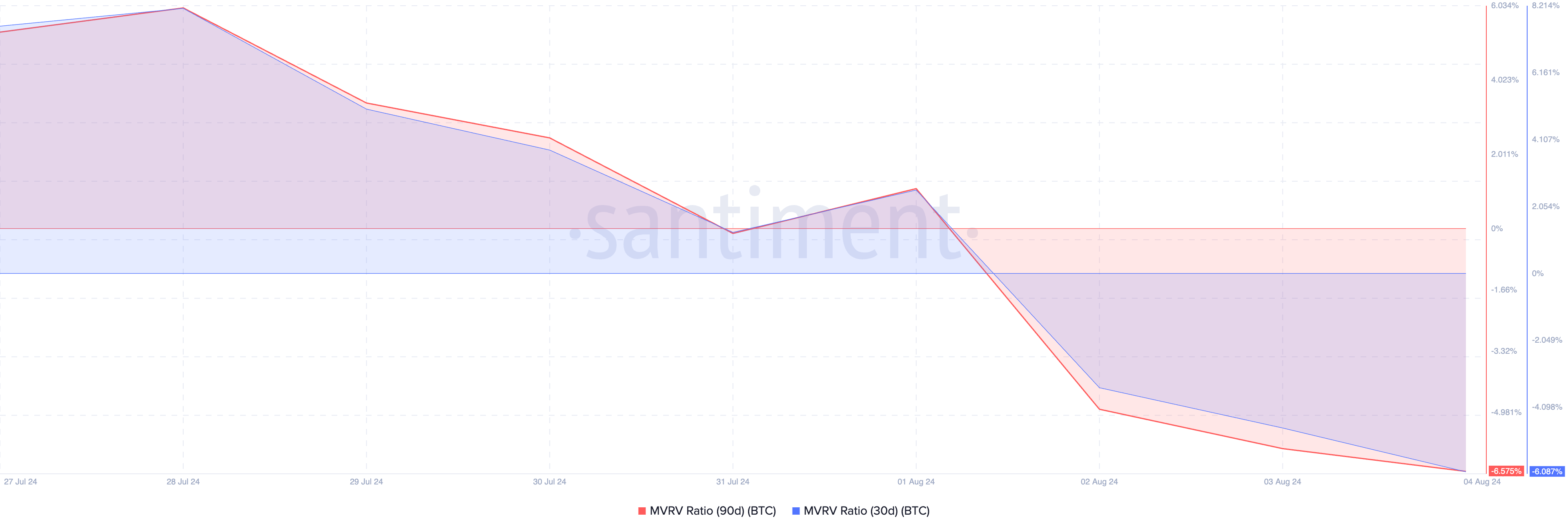 Il rapporto tra valore di mercato e valore realizzato (MVRV) del Bitcoin suggerisce che la principale criptovaluta potrebbe essere sottovalutata. Le letture negative di questo rapporto, se valutate su diverse medie mobili, lo confermano. Secondo Santiment, i rapporti MVRV a 30 e 90 giorni sono rispettivamente -6,08 e -6,57.