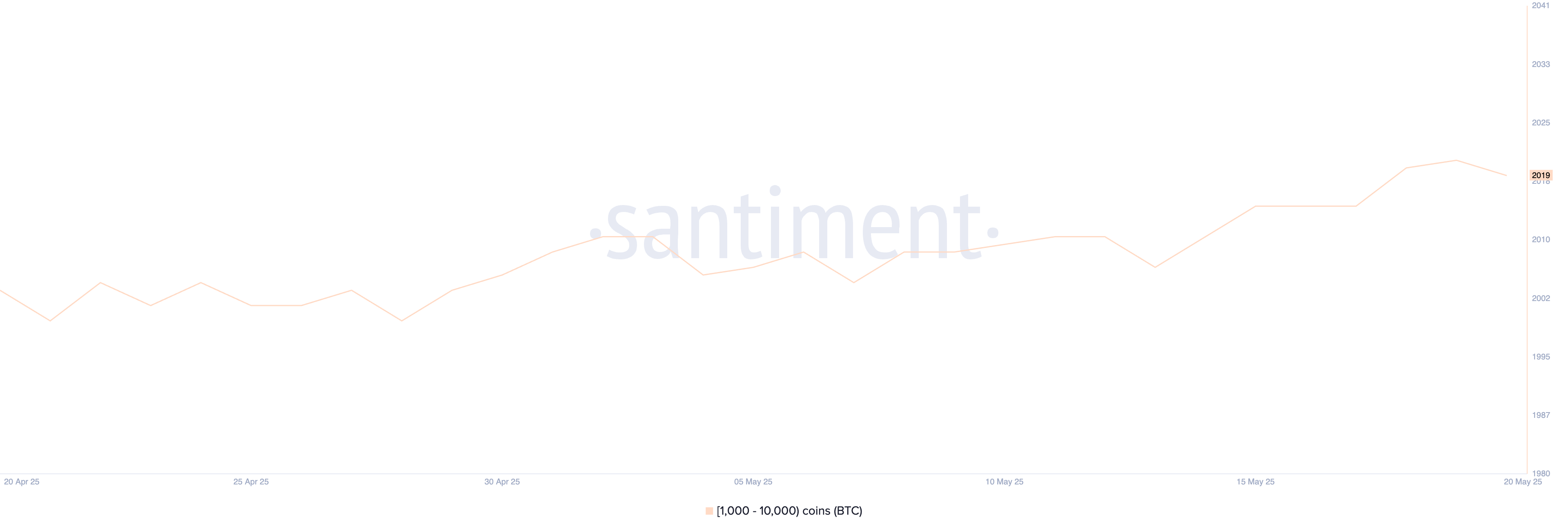 Il numero di balene di Bitcoin—wallet che detengono tra 1.000 e 10.000 BTC—è aumentato da 2.007 a 2.021 tra il 13 maggio e il 19 maggio, per poi scendere leggermente a 2.019 ieri.