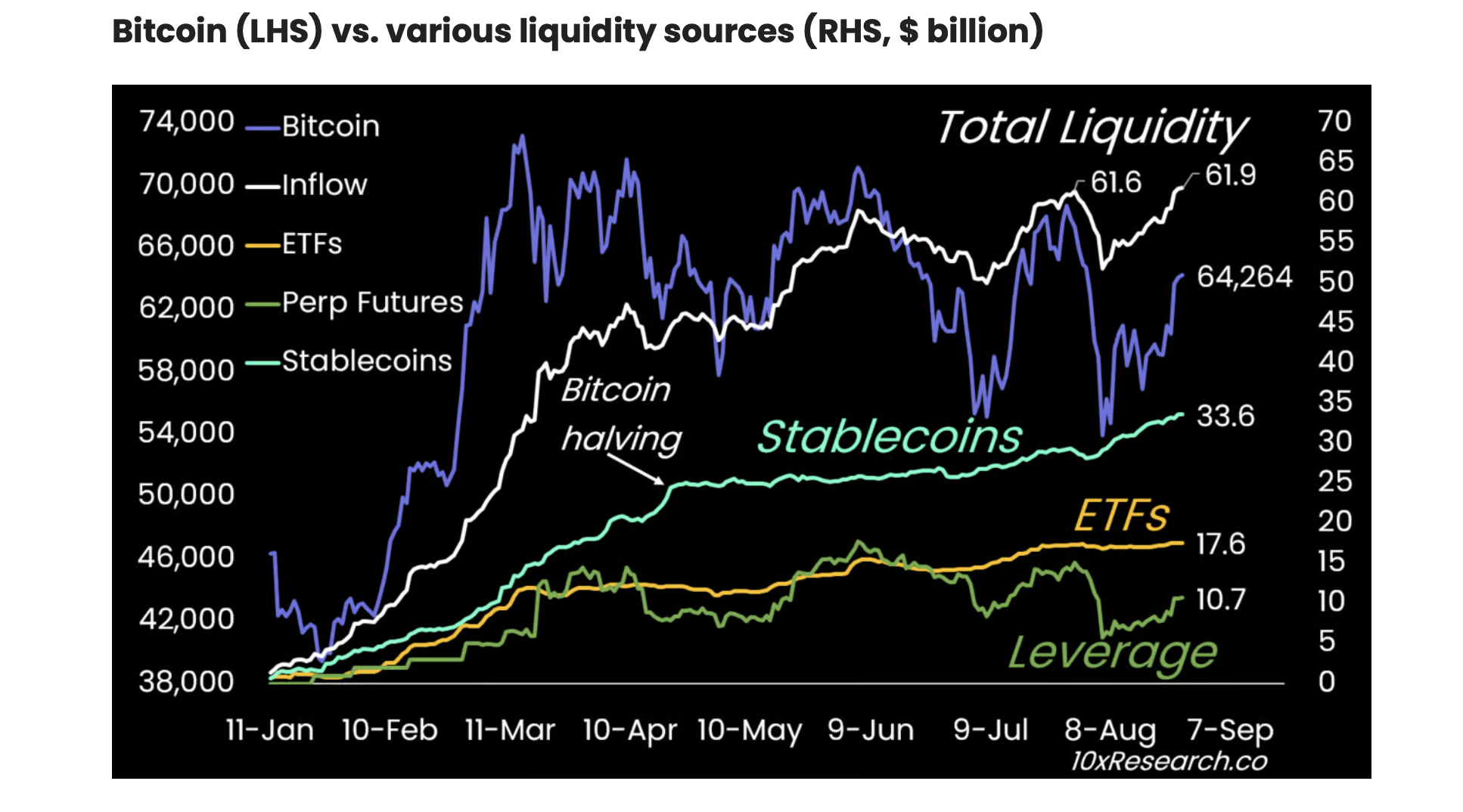 Nel suo nuovo rapporto, 10x Research ha riportato che il mercato del BTC è diventato ricco di liquidità nelle ultime settimane. Secondo il rapporto, gli afflussi totali di liquidità hanno raggiunto un massimo annuale di 61,9 miliardi di dollari, superando la picca precedente di luglio.