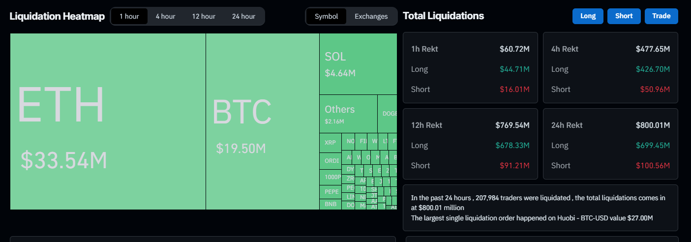 L’impatto più ampio del calo odierno è evidente anche nei numeri della liquidazione. Secondo Coinglass, la quantità di liquidazioni nelle ultime 24 ore ha superato gli 800 milioni di dollari. 699,45 milioni sono provenienti da posizioni lunghe e 100,56 milioni da posizioni corte. La più grande liquidazione singola si è verificata su Huobi con un’accoppiata BTC-USD del valore di 27 milioni di dollari.