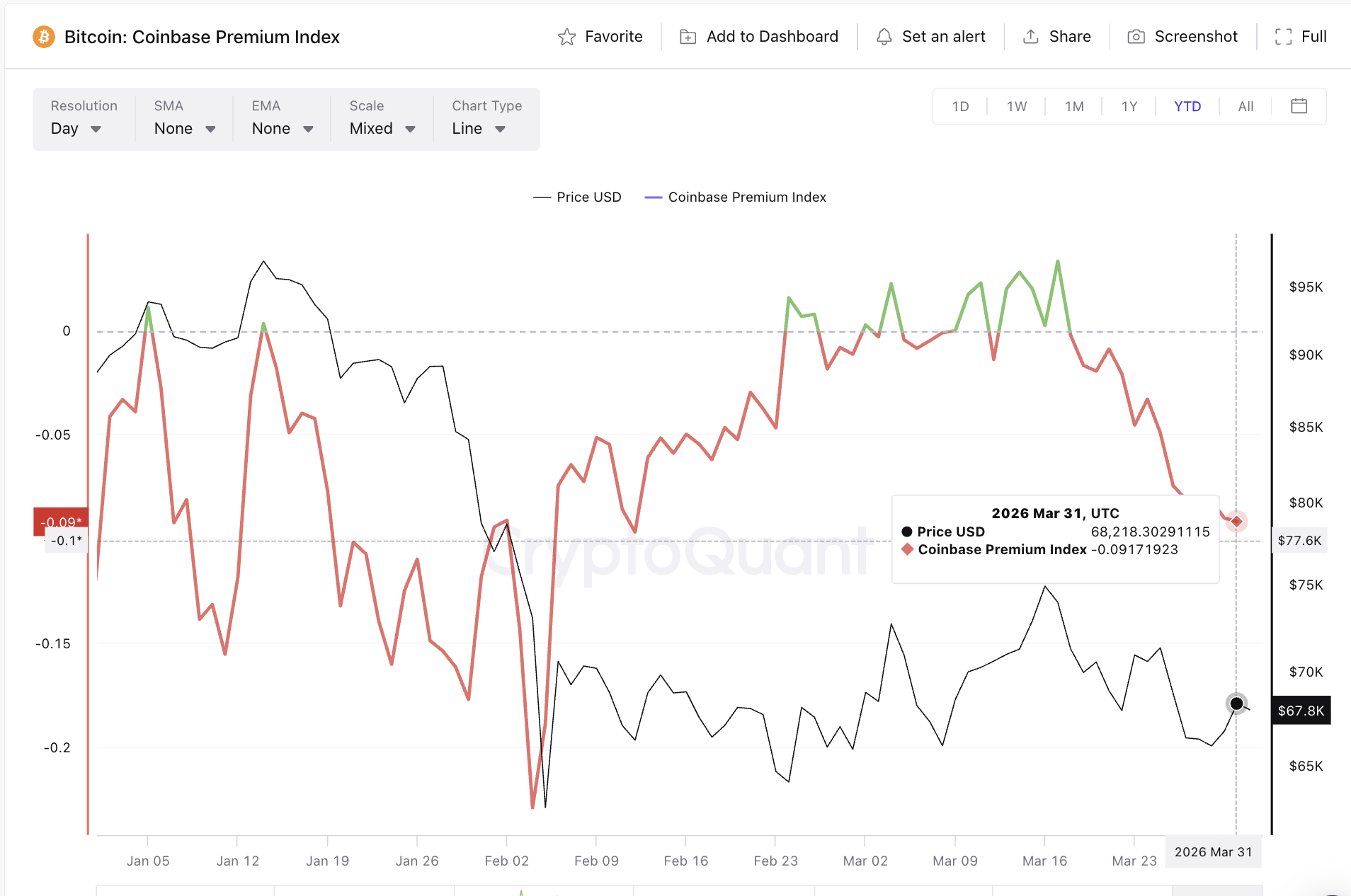 Il Coinbase Premium Index, che rappresenta un indicatore della domanda da parte degli investitori statunitensi, è sceso a -0,091 al 31 marzo secondo i dati di CryptoQuant. Si tratta di un altro valore negativo profondo per quest’anno.