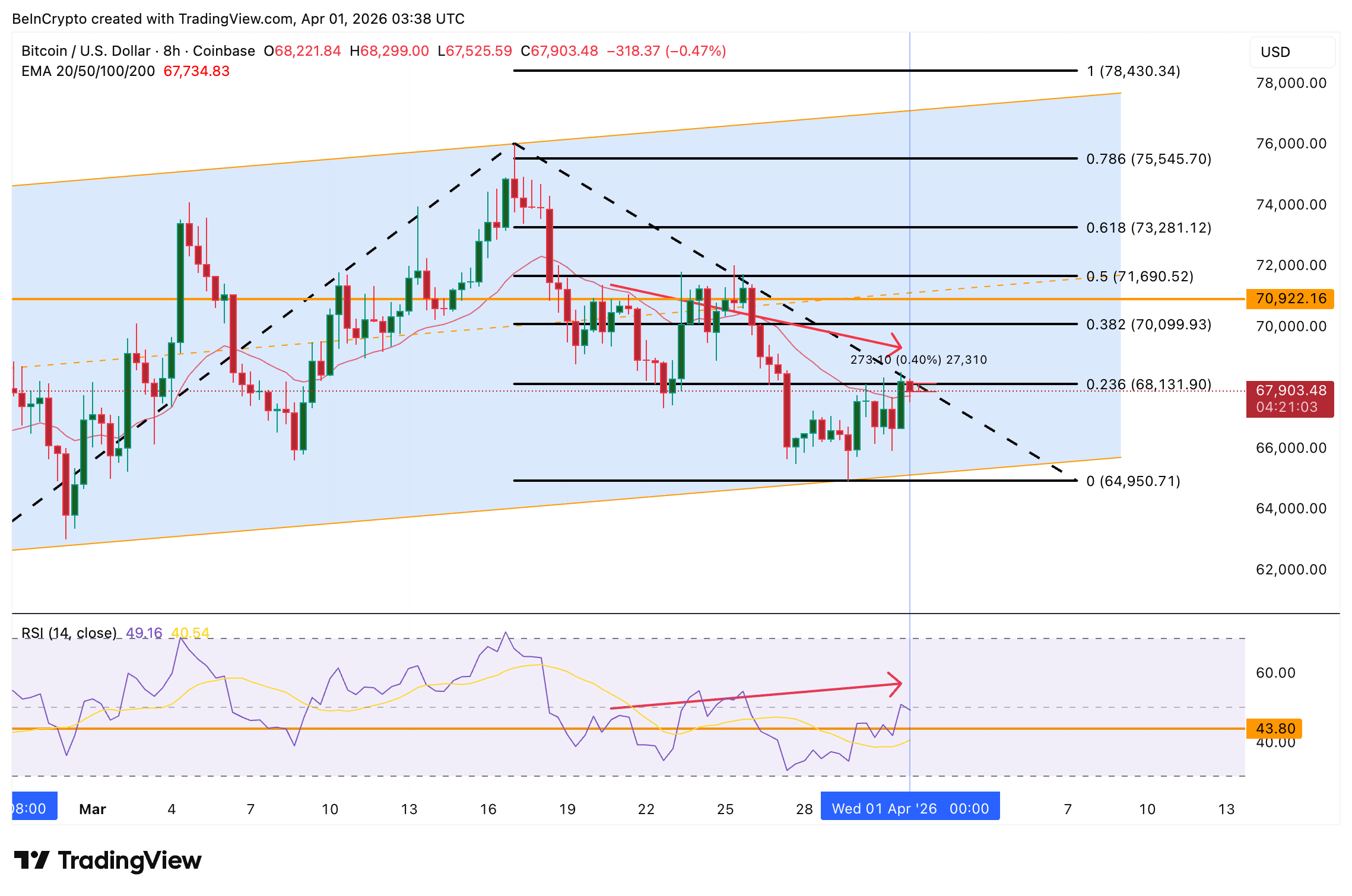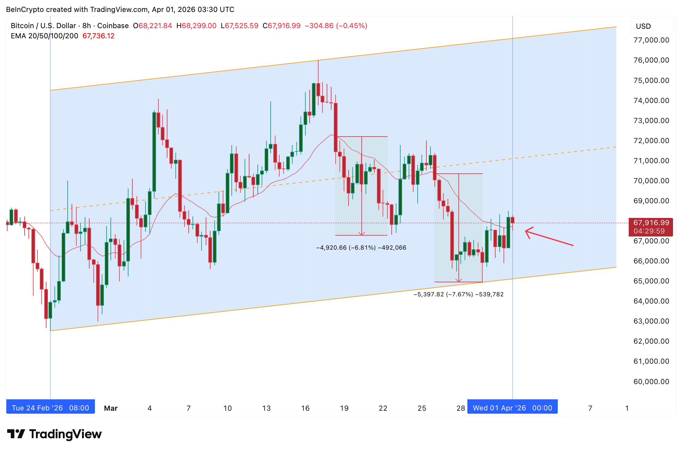 Il prezzo di Bitcoin (BTC) si è mantenuto a $67.900 il 1° aprile dopo che un’inversione degli afflussi negli ETF a fine marzo ha salvato l’asset da un terzo breakdown tecnico consecutivo sul grafico a 8 ore.