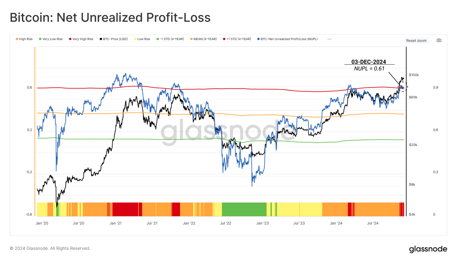 Il sentimento del mercato di Bitcoin è attualmente caratterizzato da un rischio molto elevato, come indicato dal NUPL (Net Unrealized Profit/Loss). Il NUPL ha superato 0.59, che è una deviazione standard sopra la media di 4 anni.