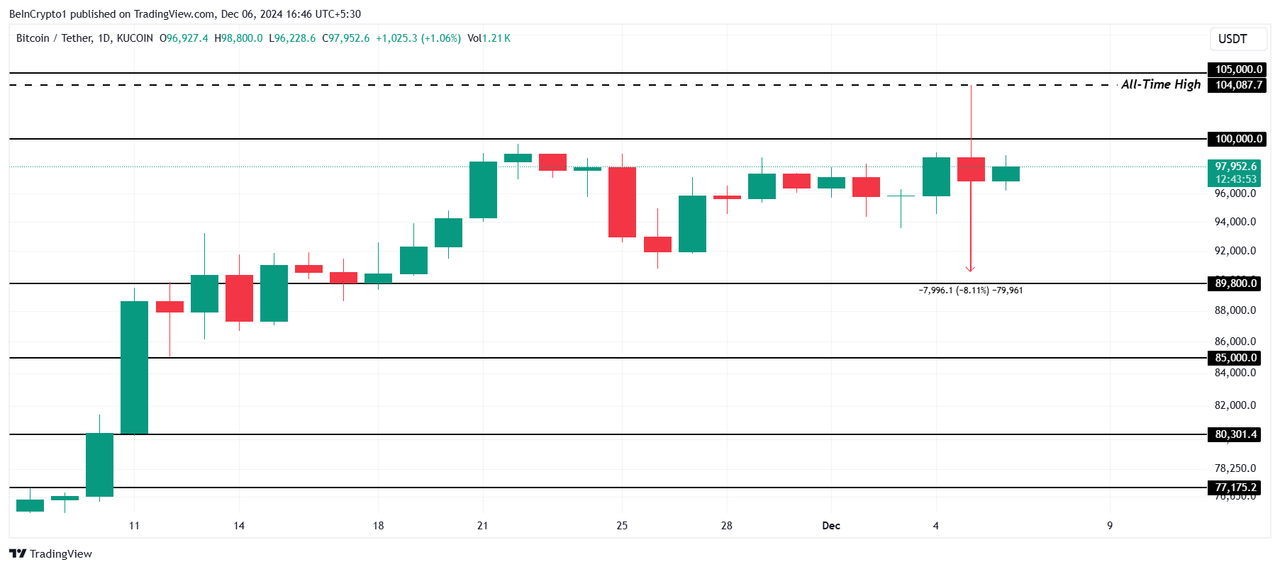 Il prezzo di Bitcoin è attualmente compreso tra 100.000 USD e 89.800 USD, con la volatilità che dovrebbe continuare. Se BTC riesce a superare i 100.000 USD e stabilirlo come livello di supporto, il prezzo potrebbe salire, avvicinandosi potenzialmente a 105.000 USD nelle prossime settimane. Tuttavia, se Bitcoin non riesce a mantenere lo slancio sopra i 100.000 USD, è probabile un nuovo test del livello di 89.800 USD.