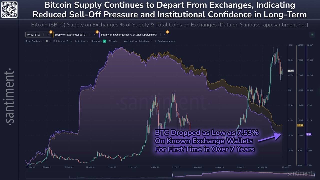 Inoltre, lo stesso giorno, la fornitura di Bitcoin sugli exchange è scesa al 7,53%, il livello più basso da febbraio 2018. Una bassa fornitura sugli exchange spesso si abbina con un comportamento di detenzione a lungo termine, creando scarsità che può far aumentare i prezzi nel tempo. Insieme, queste metriche suggeriscono che Bitcoin potrebbe entrare in una fase di accumulazione e consolidamento.