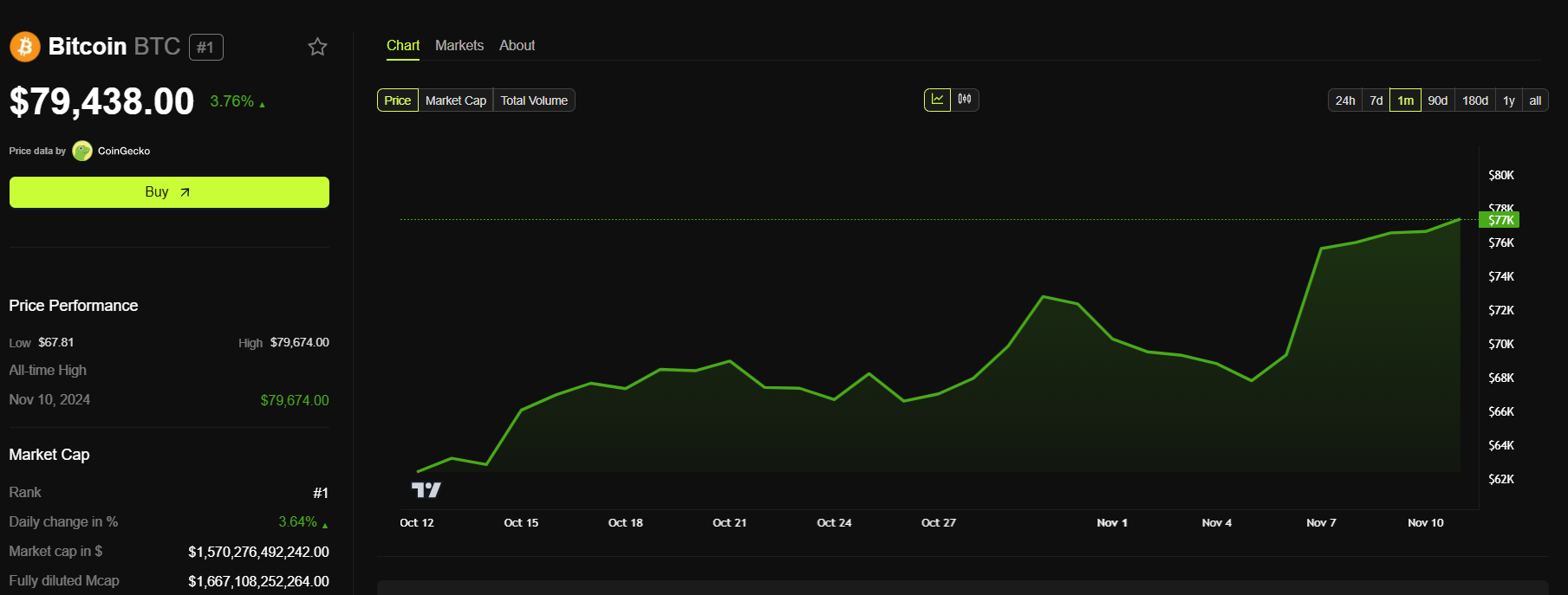 Il 10 novembre, Bitcoin ha raggiunto un picco senza precedenti di 79.600 USD, superando il suo precedente massimo storico (ATH) di oltre 77.000 USD, secondo i dati di BeInCrypto. Sebbene sia leggermente sceso a 79.326 USD al momento della stampa, il prezzo del principale asset digitale ha comunque registrato un notevole aumento di oltre il 3% nelle ultime 24 ore.
