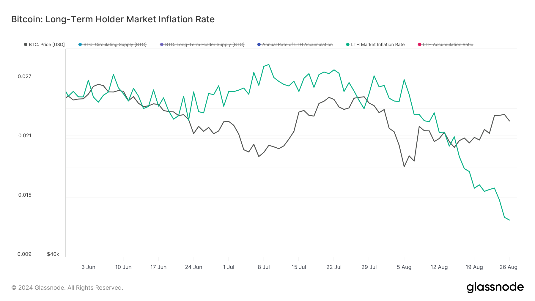 Inoltre, l’inflazione di mercato dei detentori a lungo termine, che misura il tasso annuale di accumulo o distribuzione, sembra allinearsi al non obiettivo.