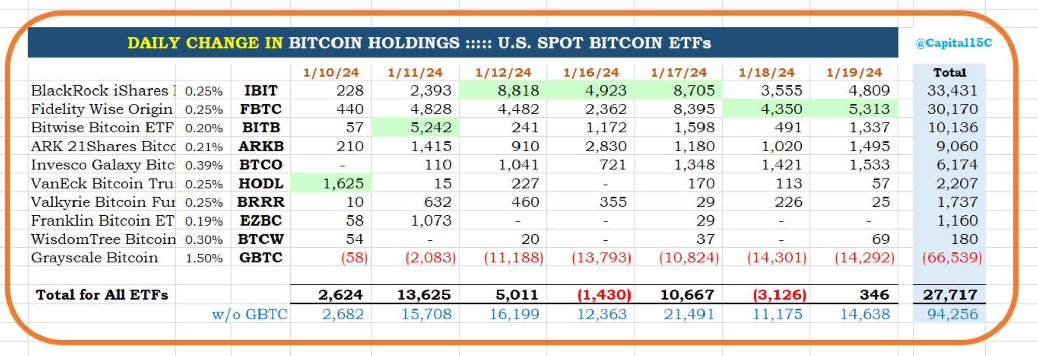 Nonostante i deflussi dal Grayscale Bitcoin Trust (GBTC), dal lancio dell’ETF sono stati acquistati 27.717 BTC su base netta, ha riportato CC15Capital il 23 gennaio. Ciò equivale a circa 1,1 miliardi di dollari ai prezzi attuali.