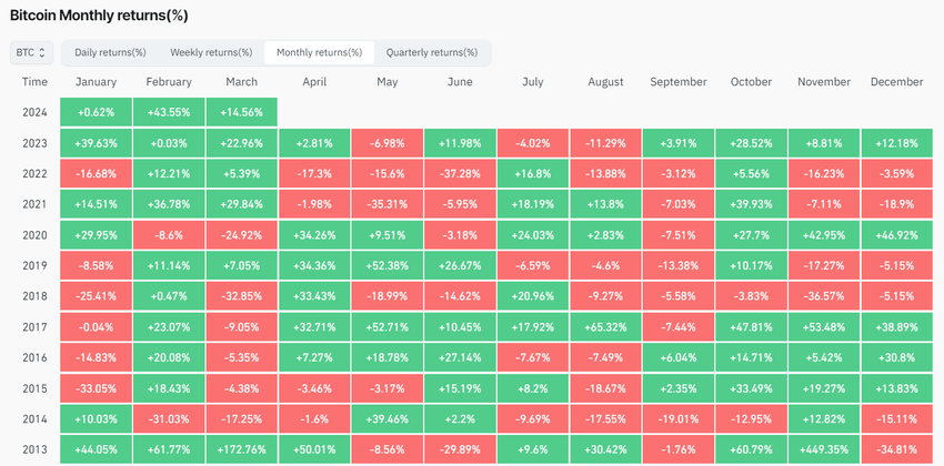 Dal settembre 2023, il Bitcoin ha costantemente superato le cifre del mese precedente, indicando una traiettoria ascendente sostenuta. Con l’avvicinarsi della fine di marzo, con il Bitcoin che scambia a 70.000 dollari, il mercato potrebbe assistere al settimo mese rialzista consecutivo per il BTC.