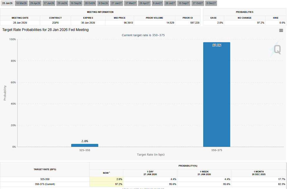 Infatti, le aspettative di tagli ai tassi sono sostanzialmente venute meno, con il CME FedWatch Tool che mostra una probabilità ridotta al 2,8%.