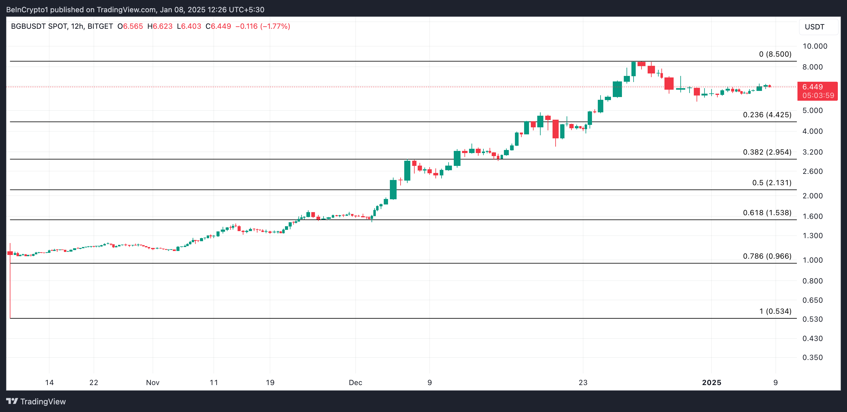 Al momento della stampa, BGB viene scambiato a 6.44 USD. Se la pressione ribassista si intensifica, perderà i guadagni attuali e aumenterà il suo declino.