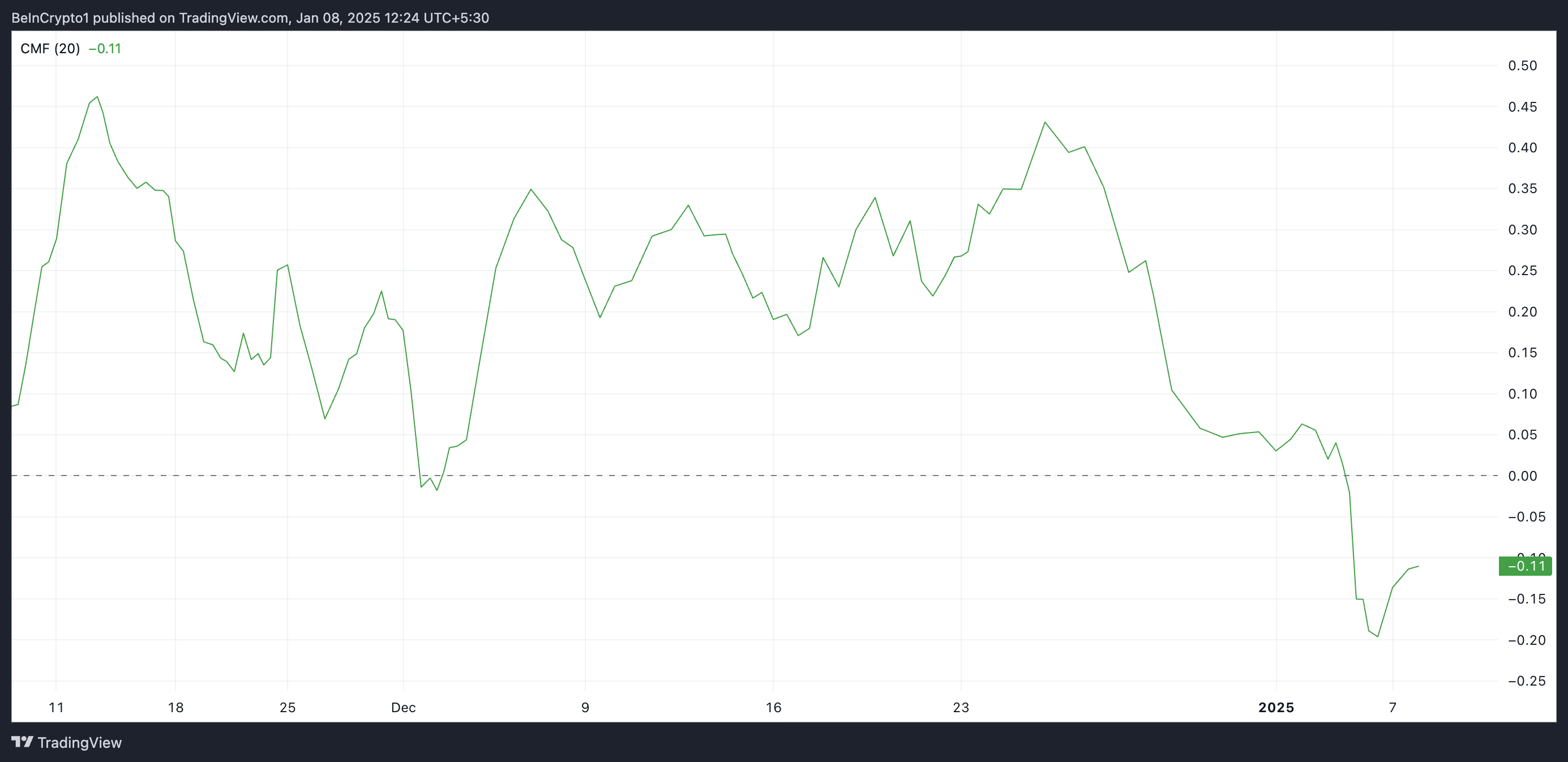 Inoltre, il Chaikin Money Flow (CMF) di BGB, che misura il flusso di denaro in entrata e in uscita dal mercato, è sotto la linea zero, confermando questa prospettiva ribassista. Al momento della stampa, è a -0.11.