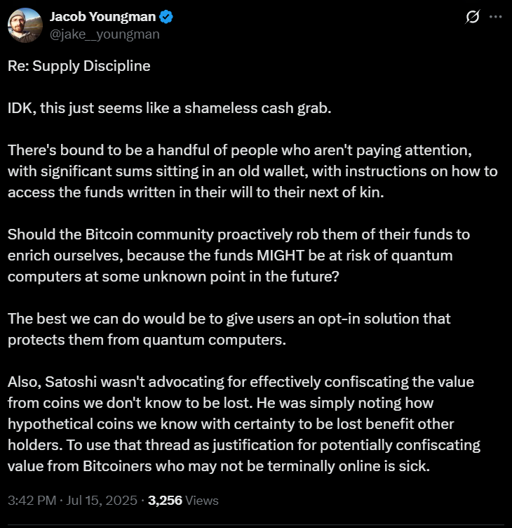 La proposta, intitolata “Post Quantum Migration and Legacy Signature Sunset”, è stata presentata il 14 luglio da contributori popolari tra cui Jameson Lopp.