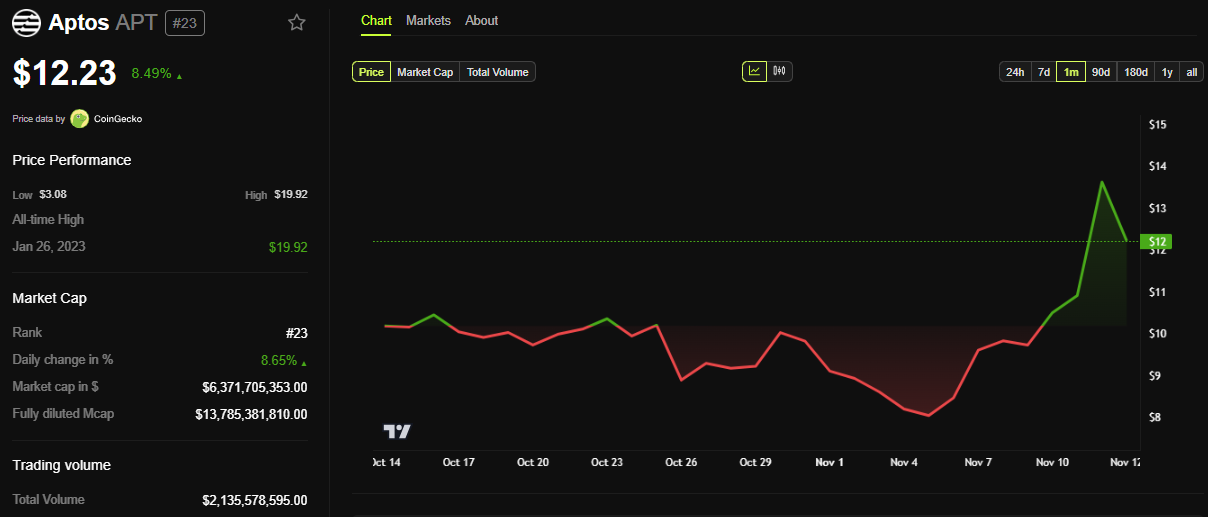 I dati di BeInCrypto mostrano che APT è aumentato di oltre l’8% con questa notizia, in linea con il più ampio aumento del mercato. Al momento della scrittura, l’altcoin è scambiato a 12,23 USD.