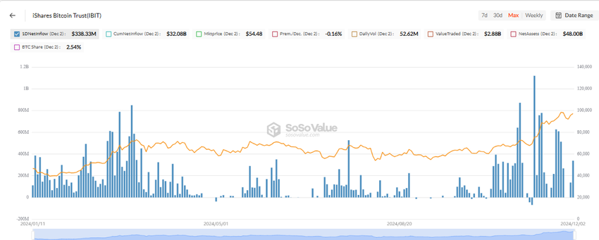 Lo strumento finanziario ha registrato afflussi vicini a 340 milioni USD lunedì. Il suo afflusso netto cumulativo era di 32,08 miliardi USD al 2 dicembre, con l’FBTC di Fidelity a 11,48 miliardi USD.