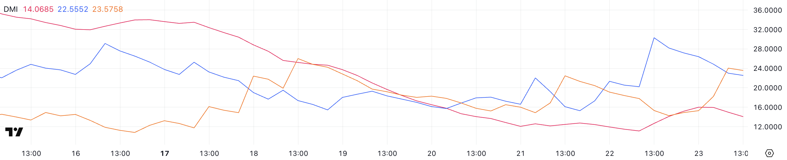 +DI è a 22,5, in aumento da 15,2 ieri ma in calo da 30,3 poche ore fa, suggerendo che la pressione d’acquisto è aumentata ma poi si è indebolita. Nel frattempo, -DI è a 23,5, in aumento da 14,2 un giorno fa, indicando una crescente pressione di vendita.