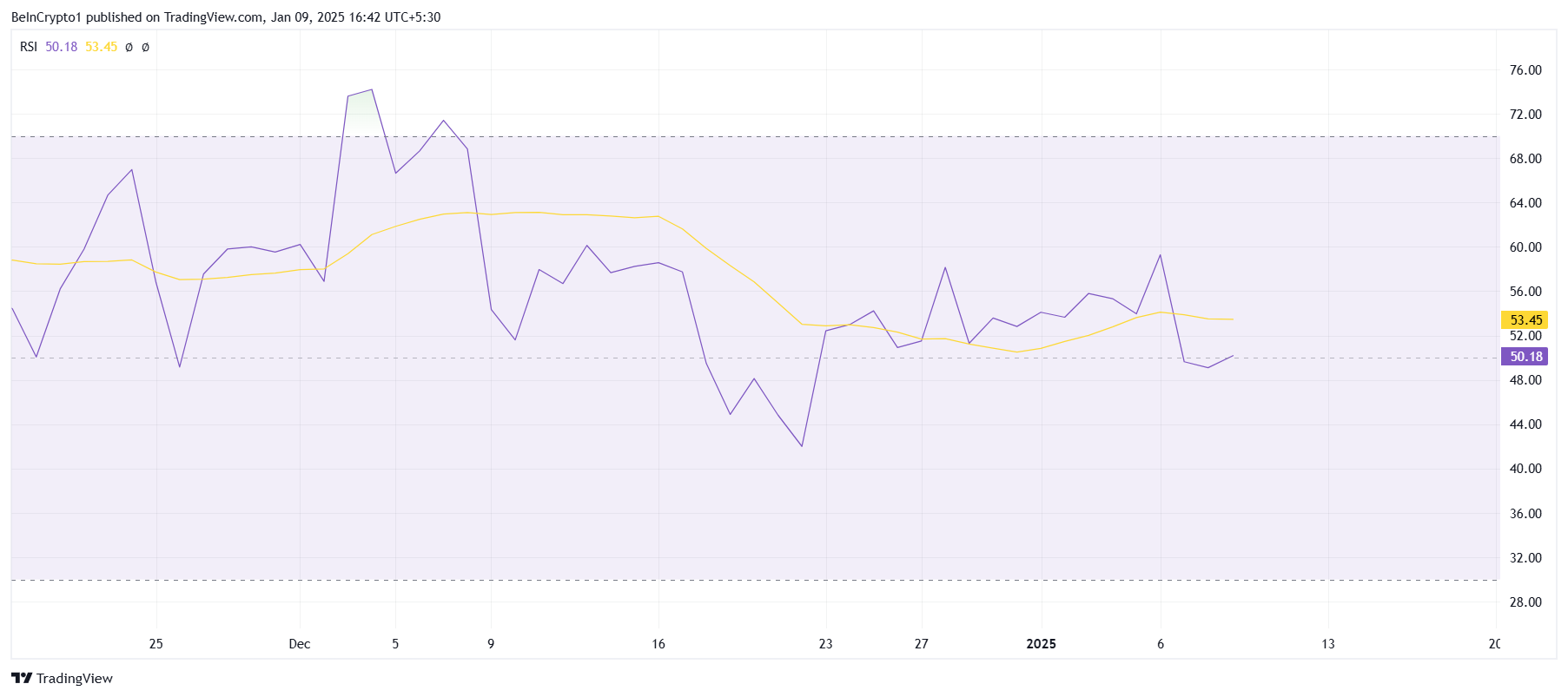 Il Relative Strength Index (RSI) è rimasto vicino alla linea neutra per l’ultimo mese, segnalando indecisione nel mercato. Mentre BNB ha mostrato momenti di slancio rialzista, non è stato abbastanza forte da guidare un significativo aumento del prezzo. Questa stagnazione riflette un sentimento debole influenzato dalle condizioni di mercato più ampie.