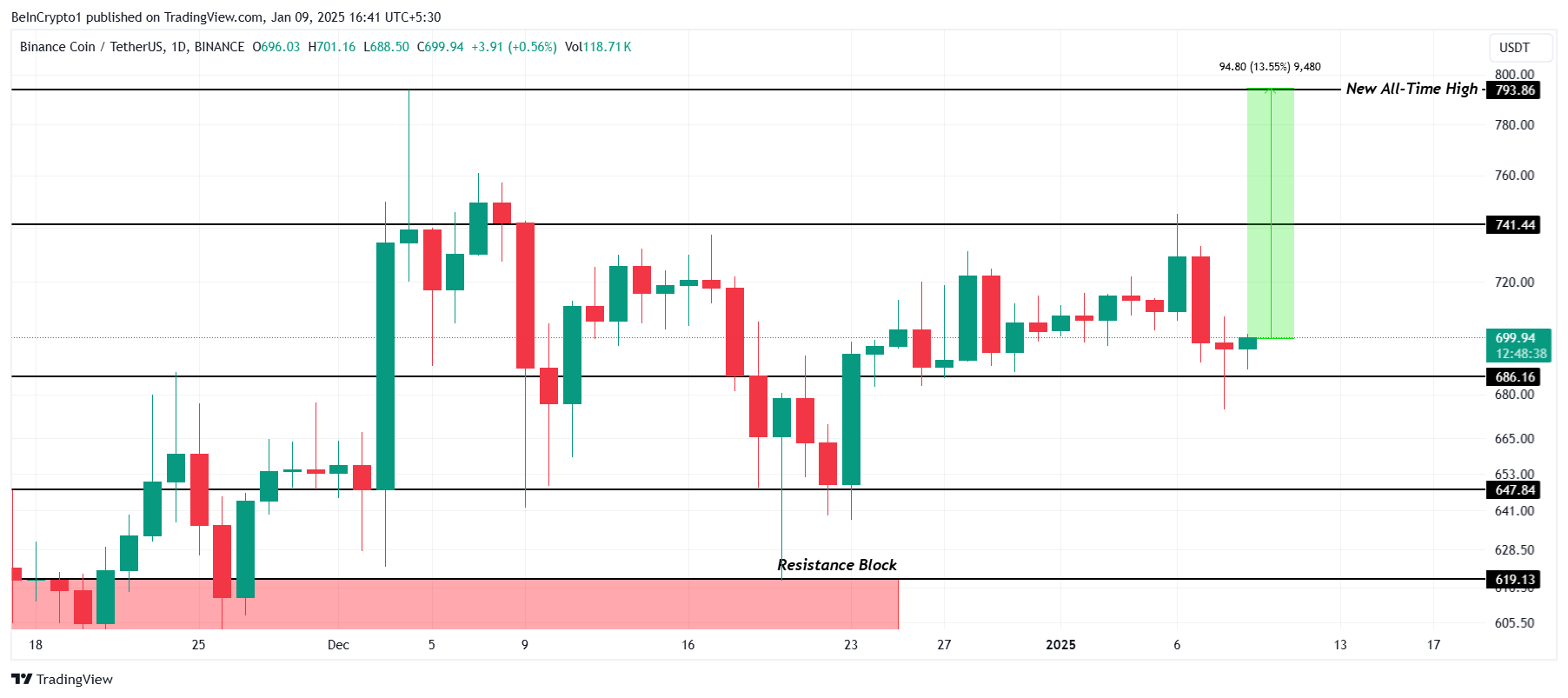 BNB sta tentando di superare il livello di resistenza di 741 USD, che rappresenta una barriera critica per raggiungere il suo massimo storico (ATH) di 793 USD.