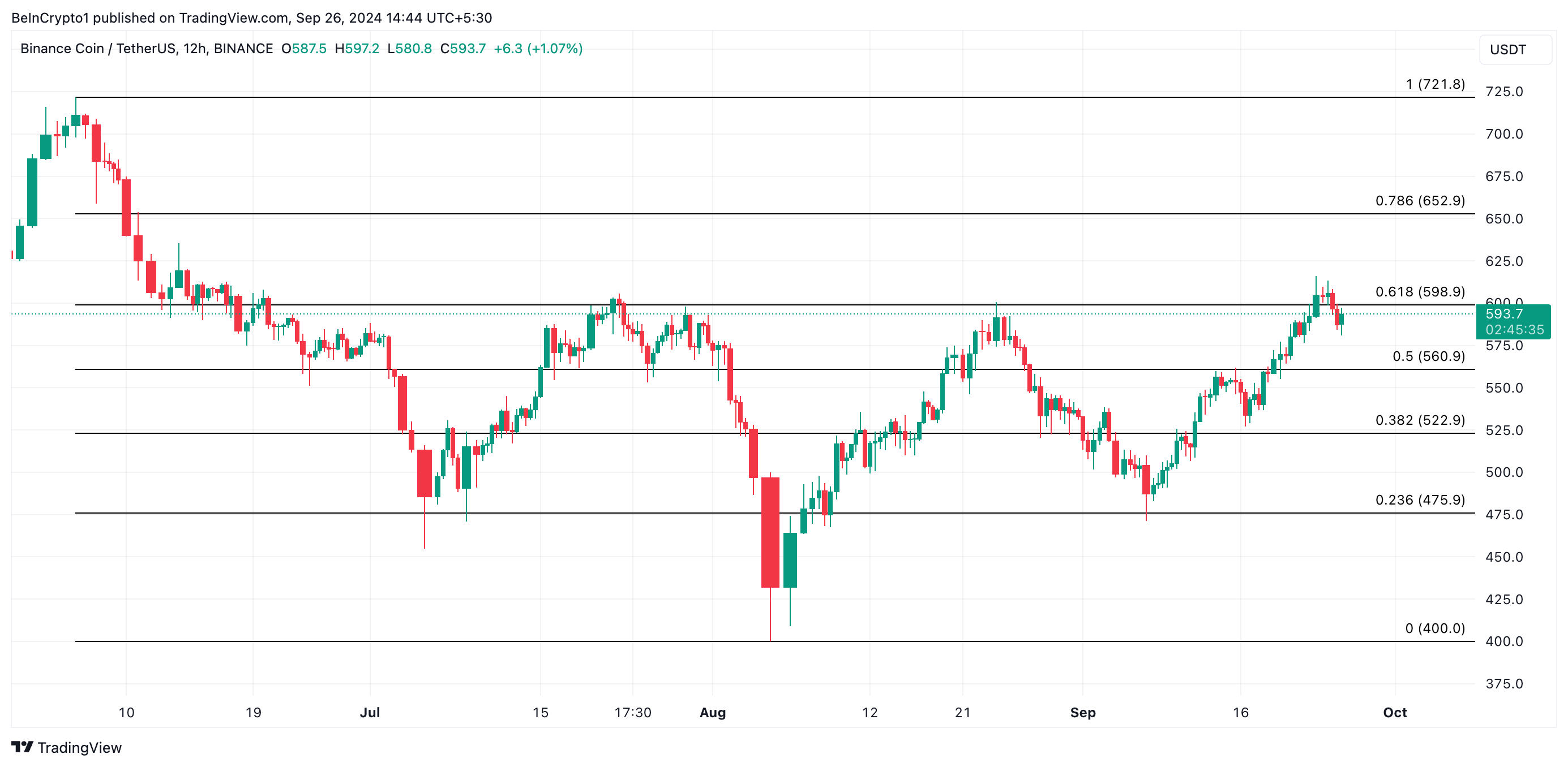Tuttavia, se il sentiment di mercato diventa positivo e l’attività di acquisto riprende, il prezzo di BNB potrebbe rimbalzare, potenzialmente raggiungendo 652,90 USD, invalidando le precedenti proiezioni ribassiste. Un aumento del momento di acquisto spingerebbe probabilmente la moneta oltre i livelli di resistenza chiave, segnalando una rinnovata fiducia.