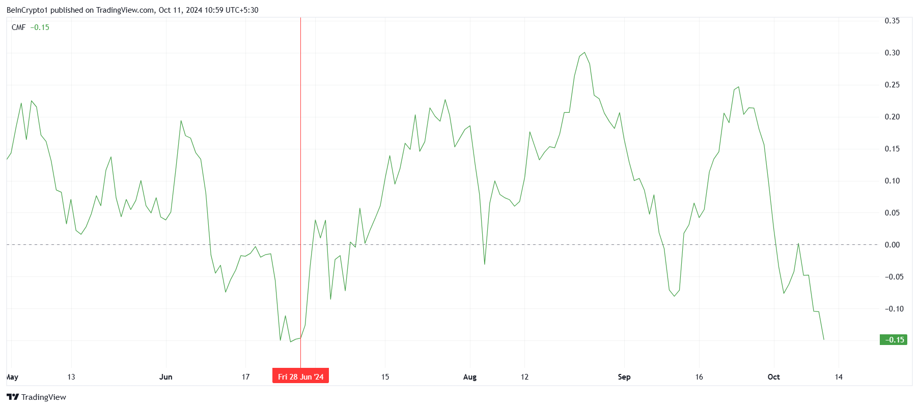Lo slancio macro complessivo di BNB rimane debole, come indicato dal Chaikin Money Flow (CMF). Attualmente il CMF è ai minimi da tre mesi, segnalando una scarsa fiducia degli investitori nell’asset. L’ultima volta che i flussi netti hanno toccato questo minimo risale a giugno.
