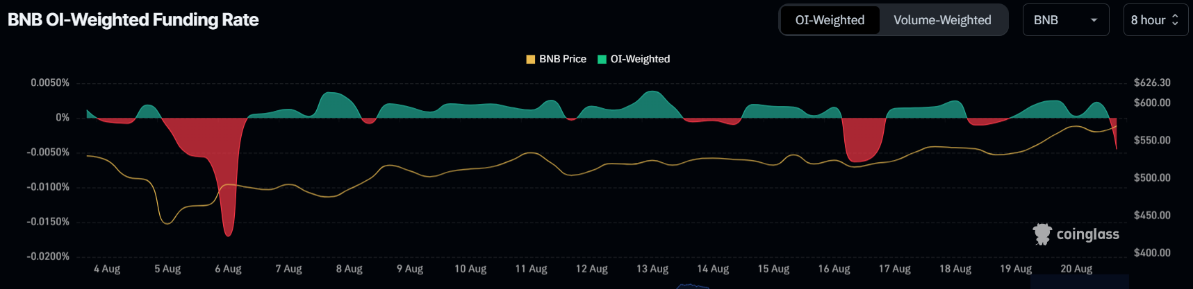 Il cambiamento di tono tra i suoi investitori sta ulteriormente influenzando il prezzo di BNB. Il tasso di finanziamento negativo mostra che nelle ultime 24 ore i detentori di BNB hanno osservato un cambiamento nel loro sentimento, diventando ribassisti.
