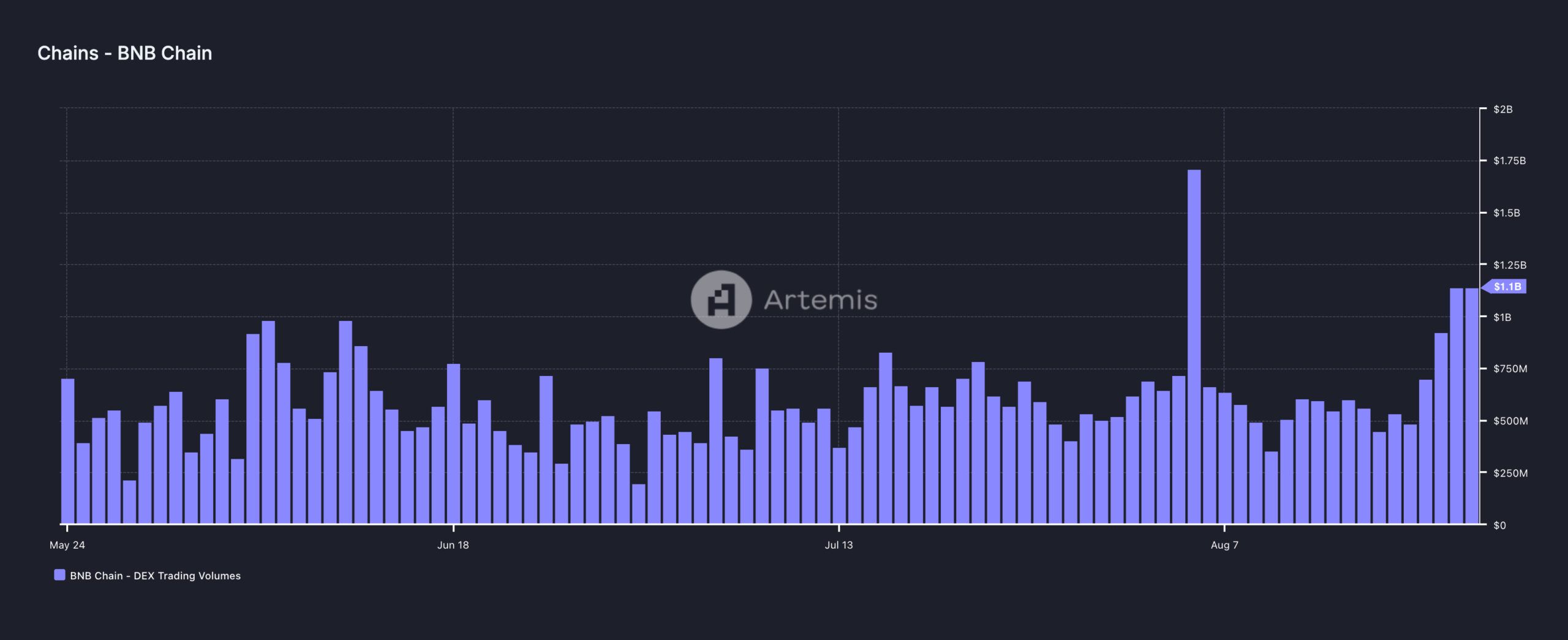 Ad esempio, secondo i dati di Artemis, il volume degli scambi sul DEX di BNB ha superato il miliardo di dollari per la prima volta dal crollo del mercato del 5 agosto. Questo volume rappresenta la quantità di criptovalute scambiate al di fuori di piattaforme centralizzate come Binance.