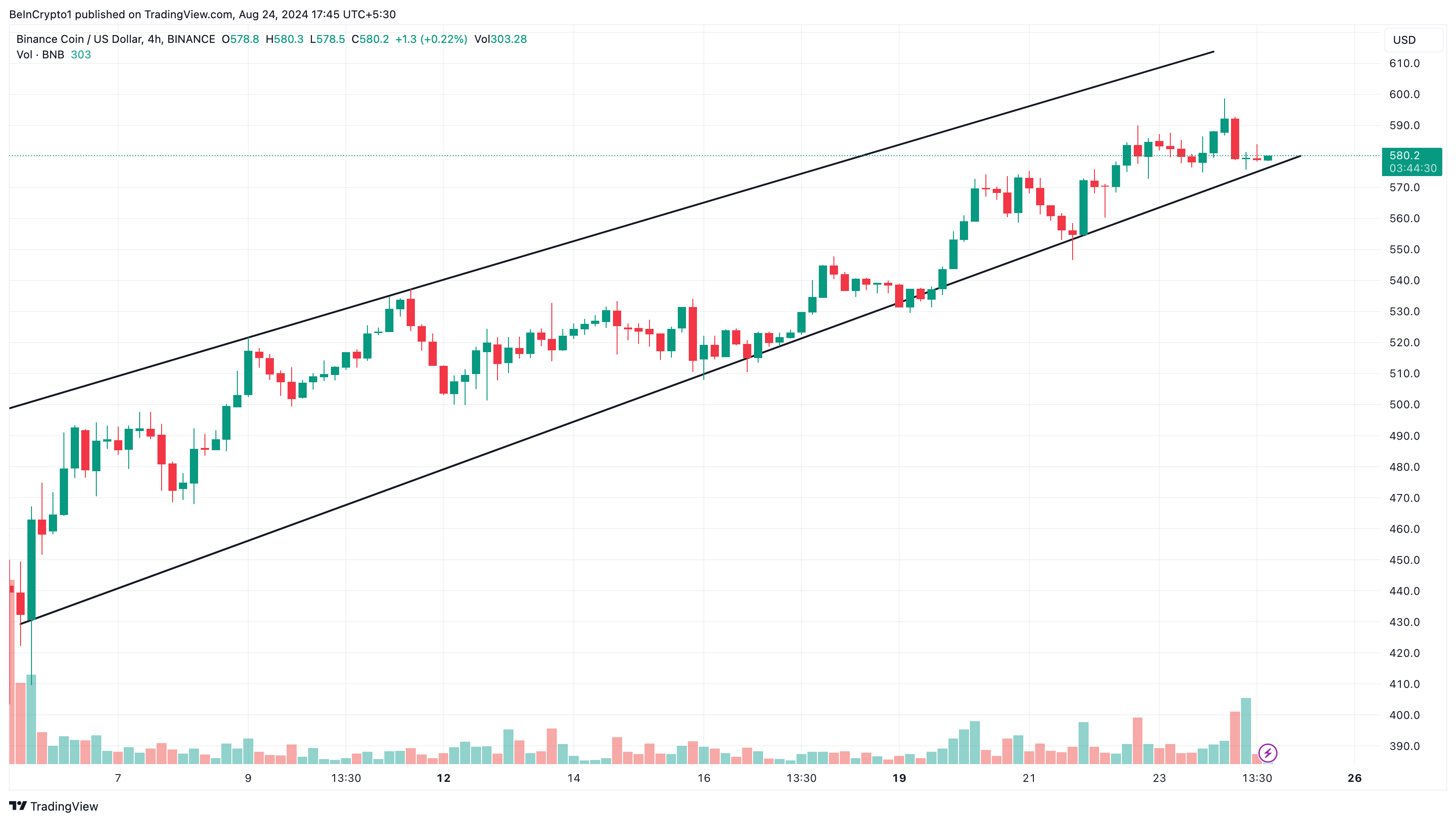 Nonostante le fluttuazioni di prezzo di BNB, il grafico a 4 ore indica che si sta muovendo all’interno di un canale ascendente.