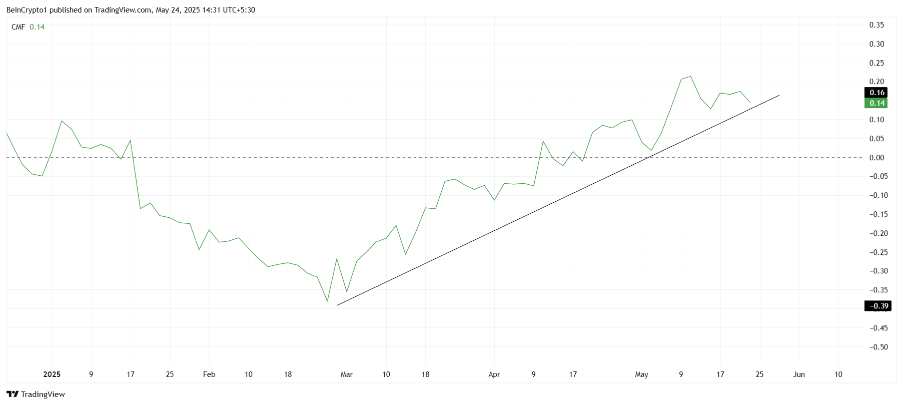 SponsoredL’indicatore Chaikin Money Flow (CMF) supporta questo ottimismo, mostrando afflussi di capitale costanti in BONK nelle ultime settimane.