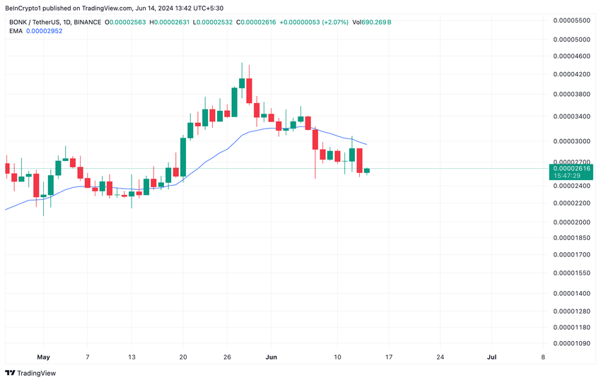 Le letture del grafico giornaliero di BONK mostrano che scambia al di sotto dell’EMA a 20 giorni dal 6 giugno. È importante sottolineare che uno scambiare persistente al di sotto dell’EMA a 20 giorni può indicare una pressione di vendita sostenuta, che potrebbe attirare altri venditori o indurre gli attuali detentori a vendere nel timore di ulteriori cali.