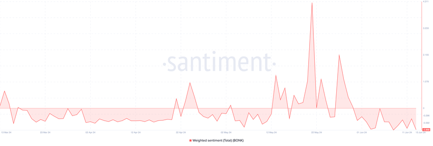 Il bias ribassista che segue BONK è confermato dal suo sentiment ponderato negativo. Questa metrica sul blockchain ha restituito solo valori negativi dal 30 maggio. Al momento della stampa, è pari a -0,86.