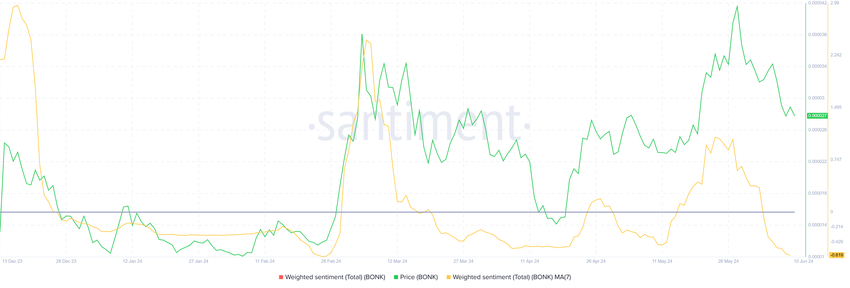 Il prezzo di BONK ha goduto dell’ottimismo dei suoi detentori, ma poiché le condizioni macro diventano sfavorevoli per il mercato delle criptovalute, questo ottimismo sembra svanire. Ciò è chiaramente evidente nel sentimento ponderato di tutti gli investitori di BONK.