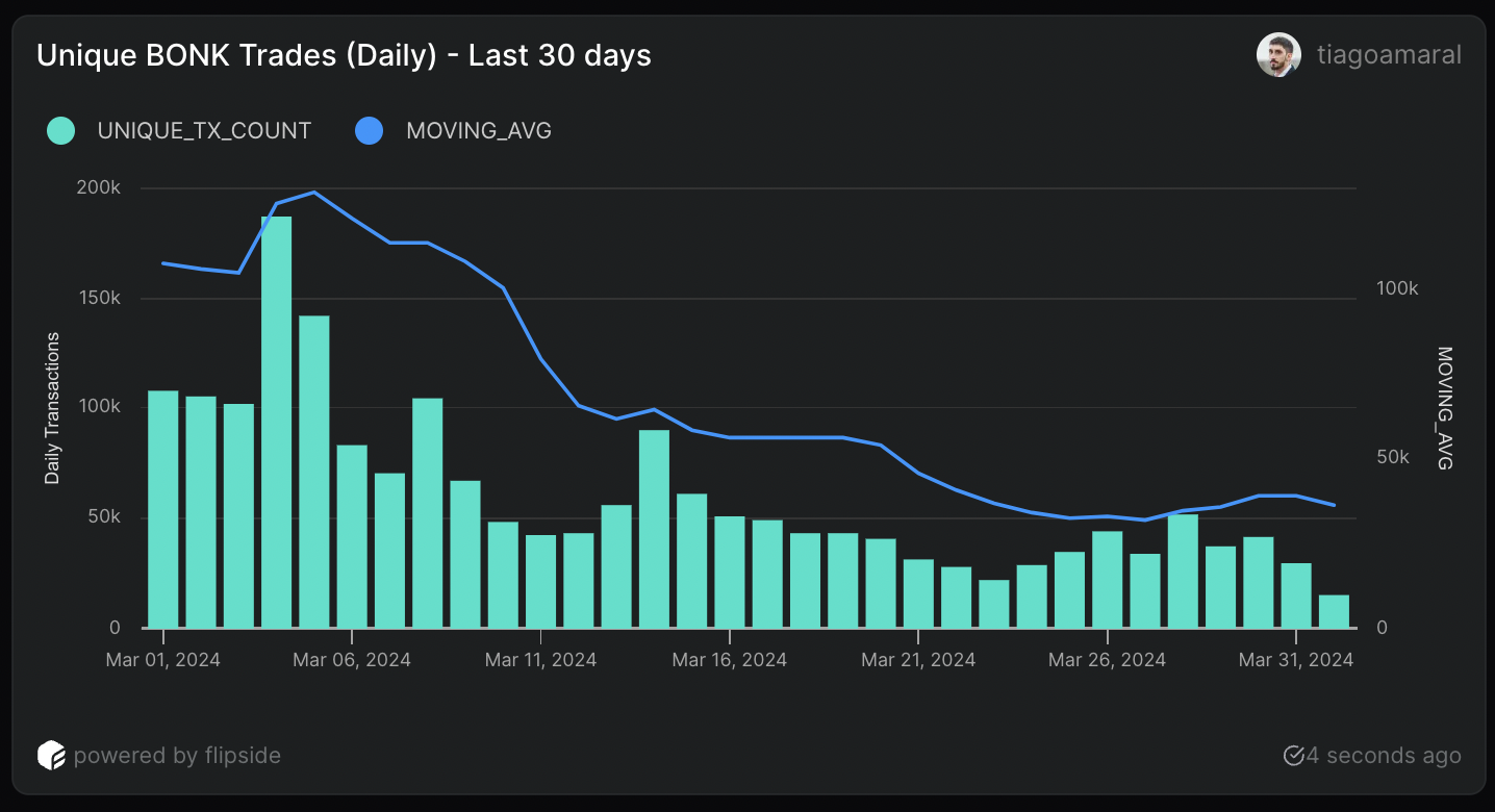 Il 4 marzo, BONK ha raggiunto un livello record, con scambiare giornalmente fino a 187.000 pezzi. Questo picco, tuttavia, è stato di breve durata. Poco dopo, è sceso ai minimi di 30 giorni con solo 22.200 scambiare al 23 marzo. Inoltre, la media mobile a 7 giorni degli scambi di BONK è diminuita negli ultimi giorni. L’attività di trading ha iniziato a diminuire, passando da 51.600 il 28 marzo a 29.300 il 31 marzo.