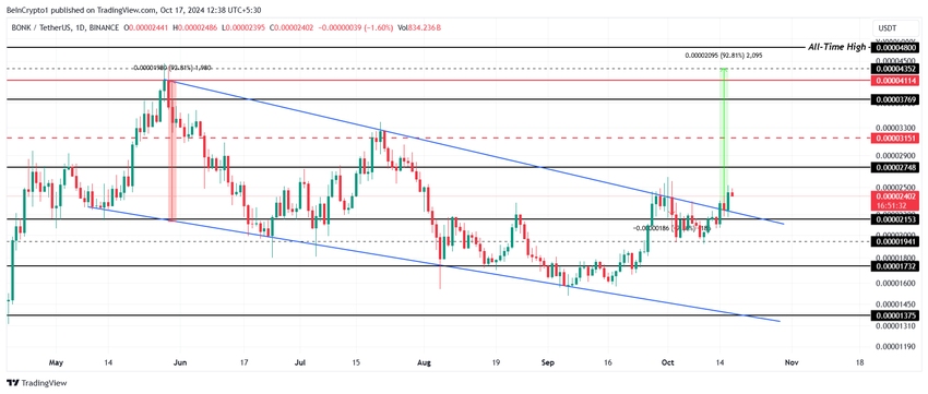 Il prezzo di BONK ha recentemente visto una significativa uscita da un modello di cuneo discendente vecchio di cinque mesi. Tipicamente considerato rialzista, questo modello segnala un potenziale aumento del prezzo della criptovaluta.